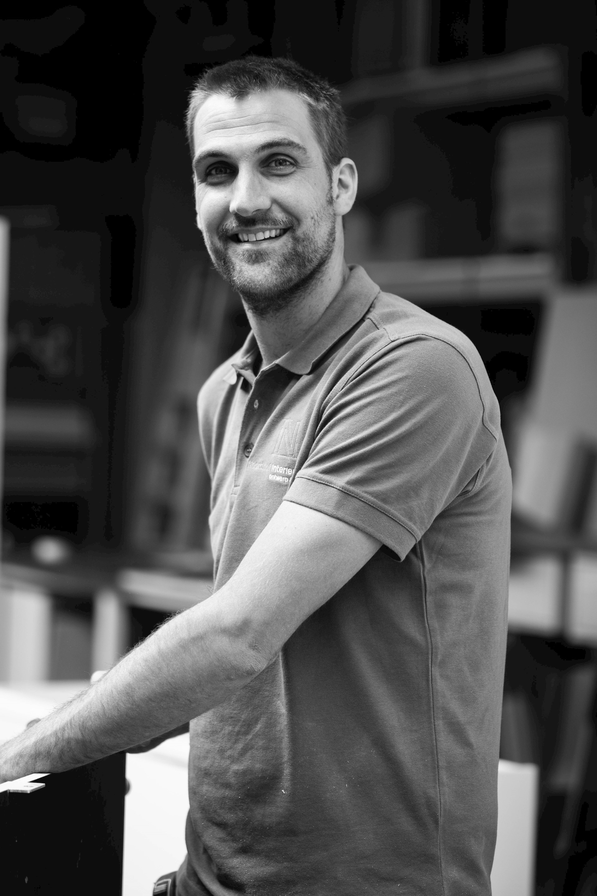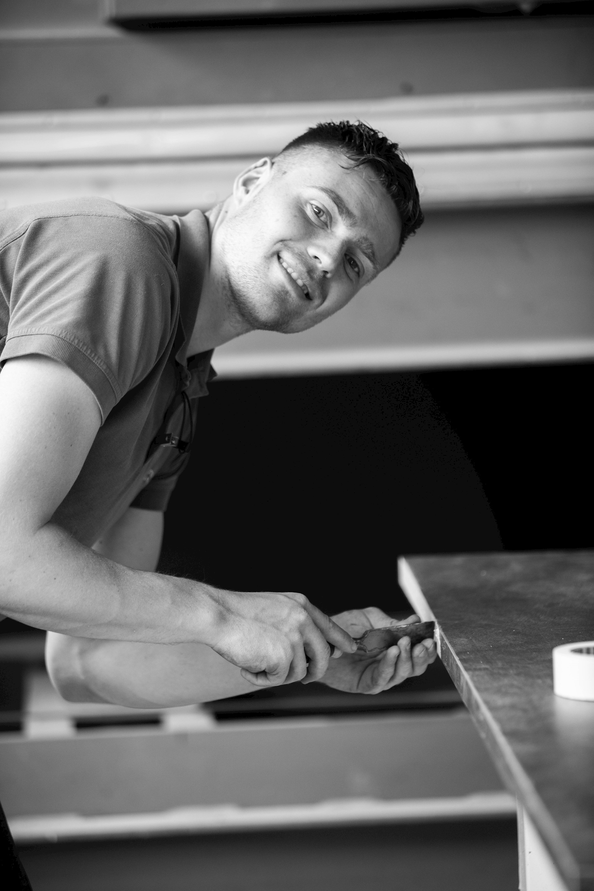 Grondlegger van Noordhof interieurbouw en kijkt met een schuin oog mee